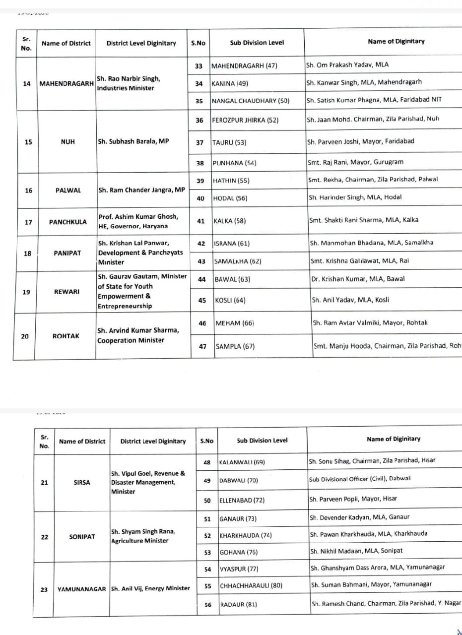 सब डिविजनल यानि उपमंडल स्तर पर भाजपा व निर्दलीय विधायक ध्वजारोहण करेंगे। जिन उपमंडल पर भाजपा के विधायकों के दायरे में नहीं आते, वहां जिला परिषद चेयरमैन, डिविजनल कमिश्नर, मेयर ध्वजारोहण करेंगे। वहीं, महेंद्रगढ़ में ध्वजारोहण के लिए दो नाम लिखे गए हैं। इनमें मंत्री राव नरबीर सिंह और विधायक ओमप्रकाश यादव शामिल हैं।